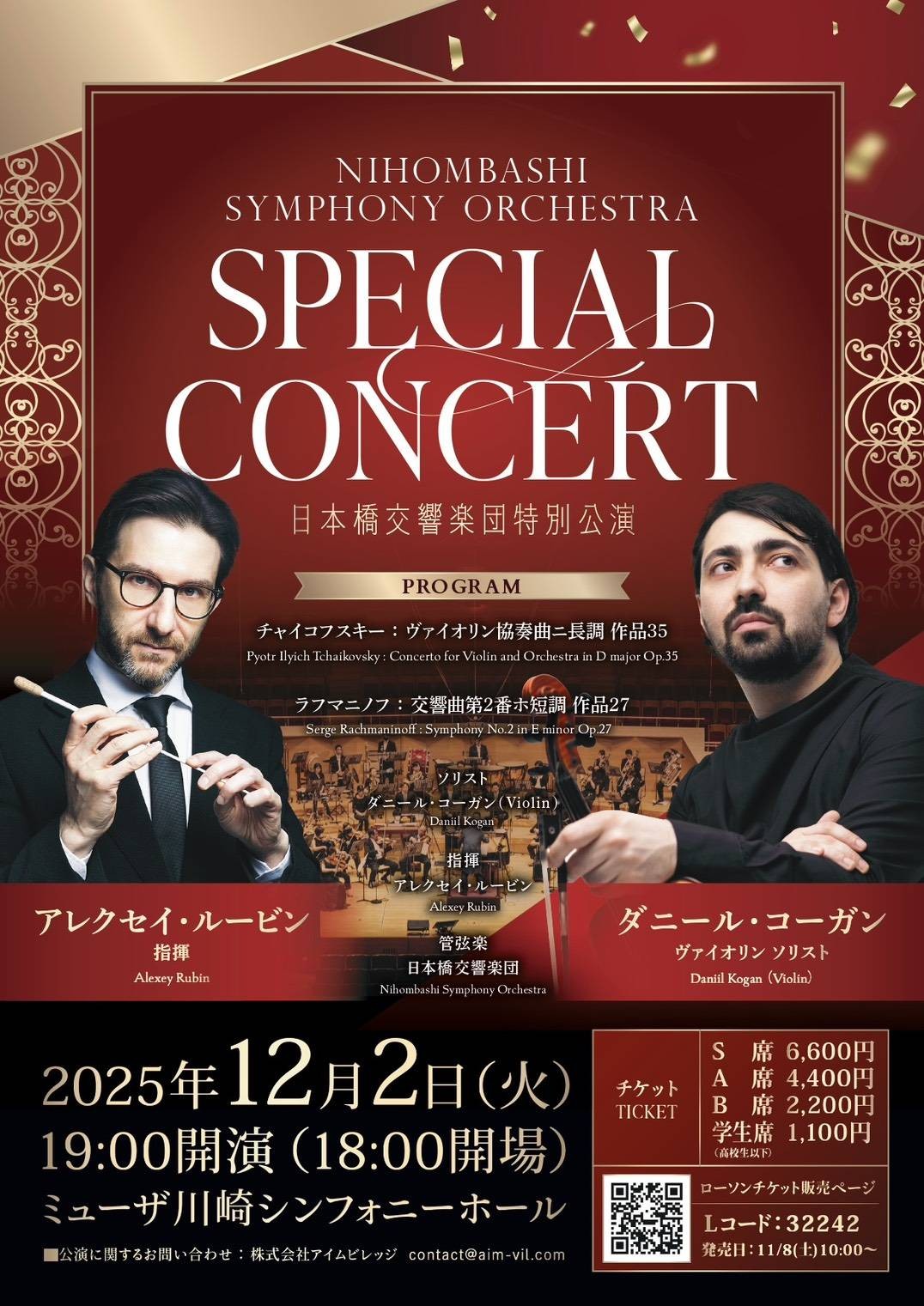 今モスクワで素晴らしい活躍をしているマエストロルービンの選んだロシアのプログラム、チャイコフスキーのヴァイオリン協奏曲とラフマニノフの交響曲2番という素晴らしい名曲を二曲演奏致します。今回のソリストのダニエル・コーガンはあの往年の巨匠、レオニド・コーガンの孫でロン・ティボ国際コンクールやチャイコフスキーの国際コンクールなど数々の著名なコンクールの入賞歴を持つ世界的な素晴らしいヴァイオリニストです。彼が奏でるチャイコフスキーヴァイオリン協奏曲を生で聴ける機会は滅多にない、ということで一人でも多くの皆様に是非聴いていただきたい、という思いでいっぱいでございます。